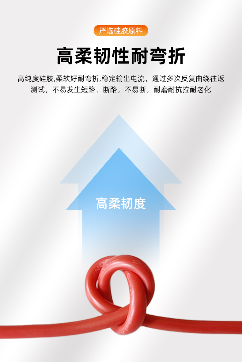 嚴(yan)選硅膠(jiao)原料,高柔韌(ren)性耐(nai)彎(wan)折(zhe),高純度硅膠(jiao),柔軟好(hao)耐(nai)彎(wan)折(zhe),穩定輸(shu)出電流,通(tong)過(guo)多次反(fan)復曲繞(rao)往返測試,不易發生短路、斷(duan)路,不易斷(duan),耐(nai)磨(mo)耐(nai)抗拉耐(nai)老化。
