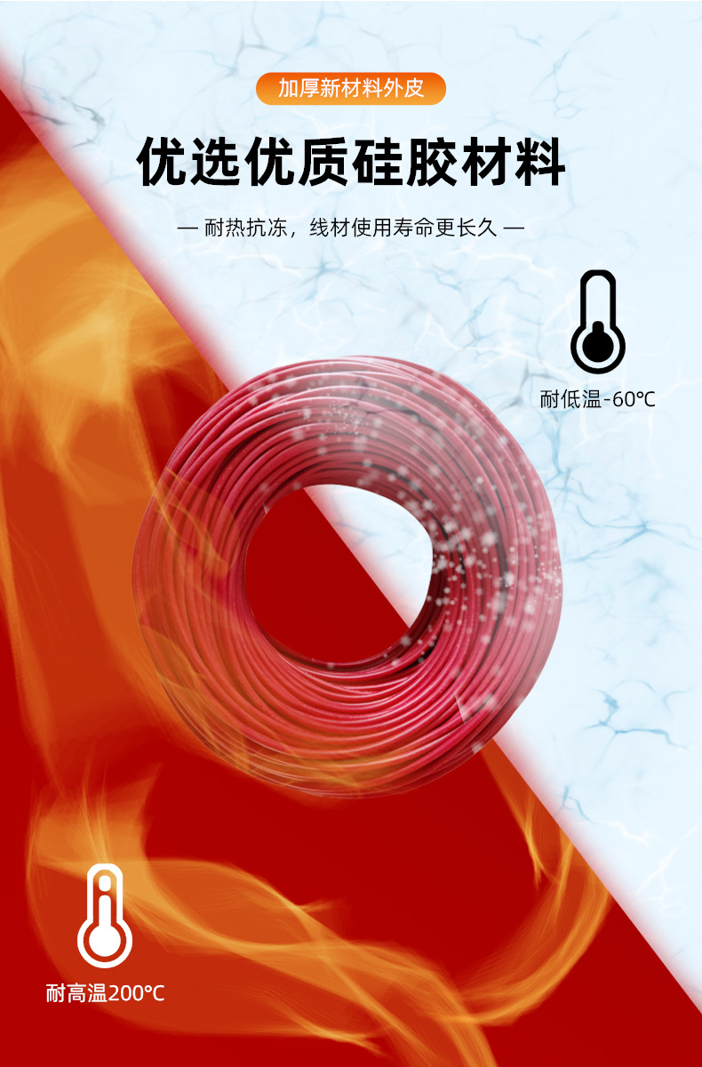 加(jia)厚新材(cai)料(liao)外皮,優選硅膠材(cai)料(liao),耐熱抗凍,線材(cai)使用壽命(ming)更長(chang)久(jiu),
